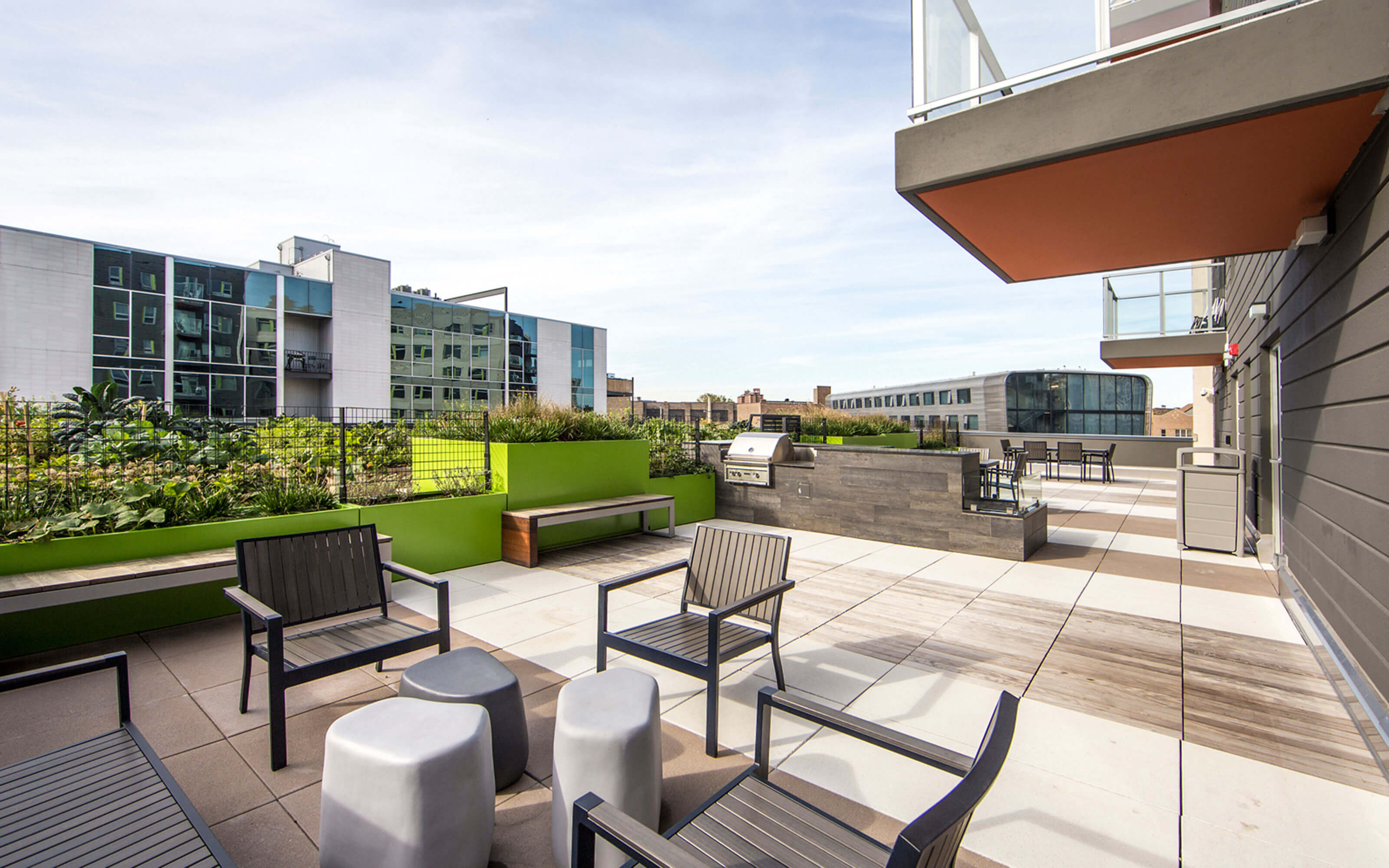 A rooftop apiary with beehives from the Chicago Honey Co-op, and a green roof with a vegetable garden.